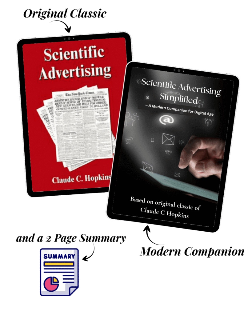 Plus you will be getting a 2 page summary of the entire book– You may call it distilled wisdom to its core. This 2-page summary gives you the essence of Claude Hopkins’ Scientific Advertising in plain, modern language—so you can grasp in minutes what many marketers spend years (and thousands of dollars) trying to figure out. It condenses Hopkins’ timeless principles into a quick, practical guide you can apply instantly to your ads, emails, and funnels—saving you time, eliminating guesswork, and giving you a proven foundation to build campaigns that actually sell.